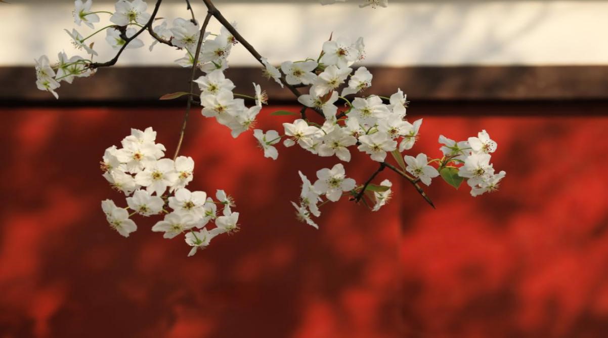白色的梨花和紅牆的光影,更像一幅油畫小品。