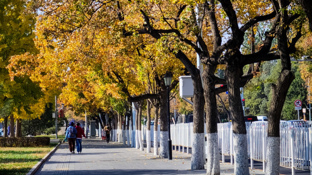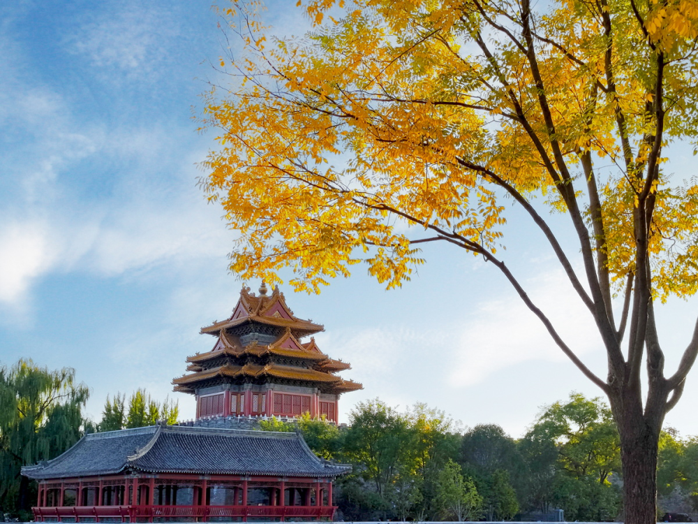 北京秋意漸濃,故宮角樓銀杏樹葉逐漸變黃。銀杏樹葉與古建築相互映襯,形成一幅浪漫秋景圖。