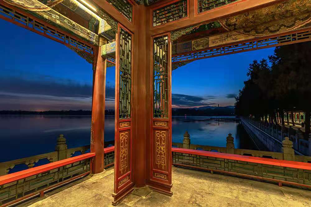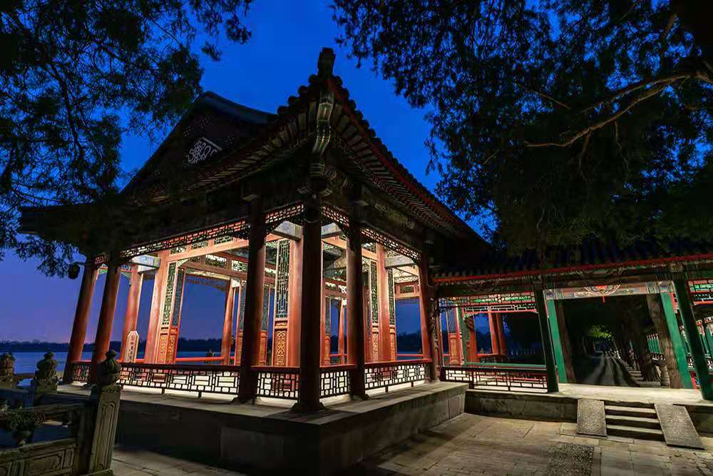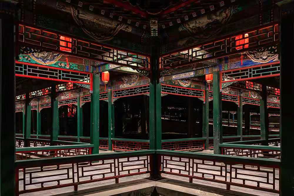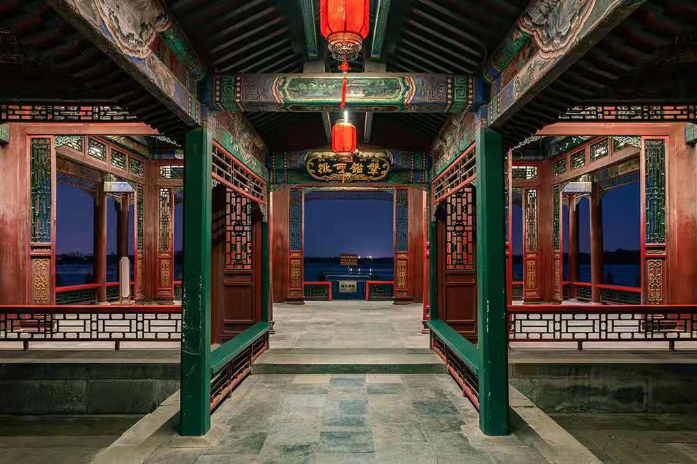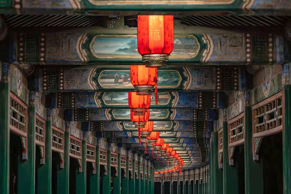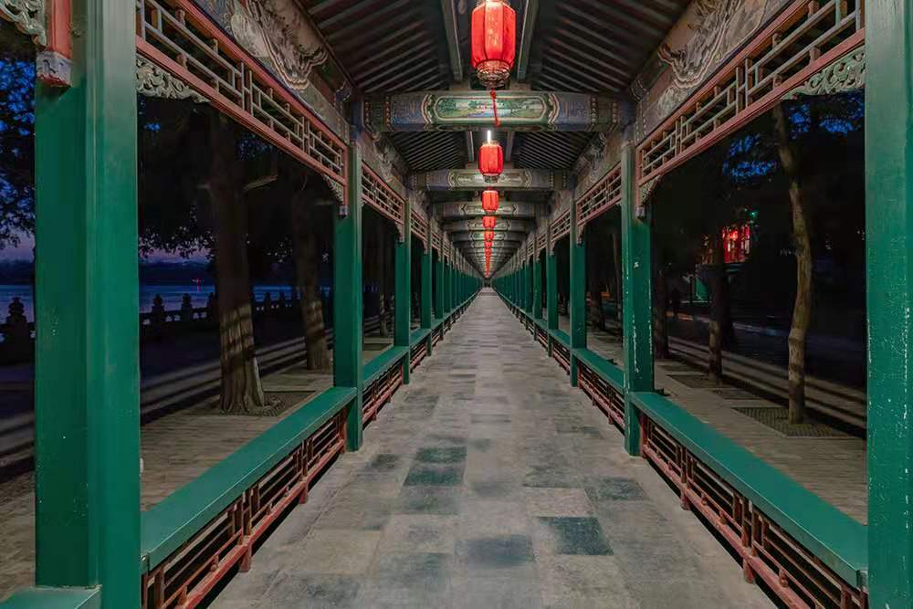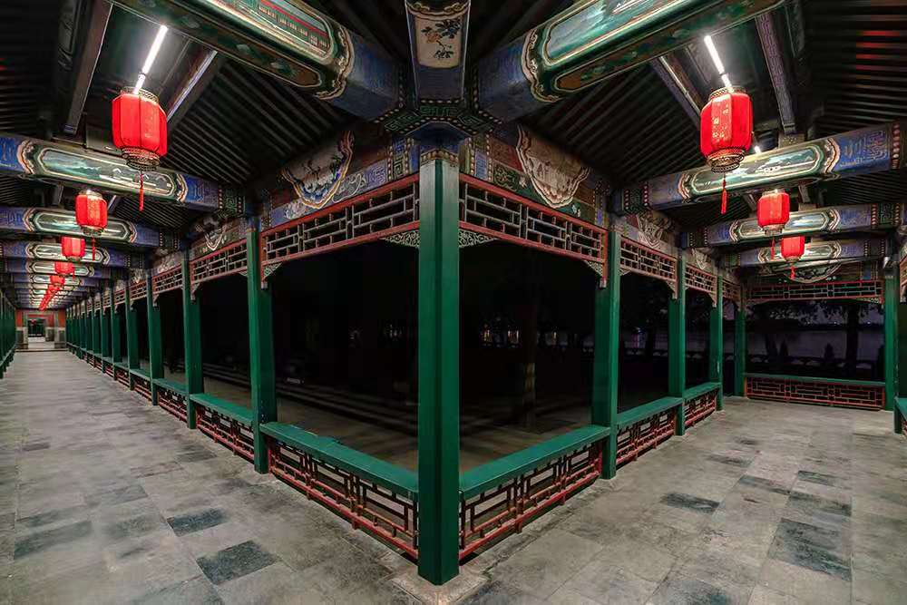 頤和園長廊在萬壽山南麓和昆明湖北岸之間。東起邀月門,西至石丈亭,中間穿過排雲門,象征春夏秋冬四季。