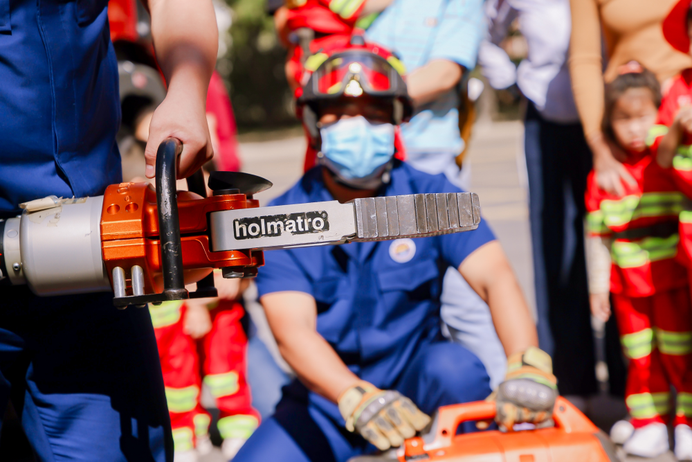 戴上消防帽,穿上消防服,和消防員叔叔同心攜力,守護家園。(攝影:趙承順)