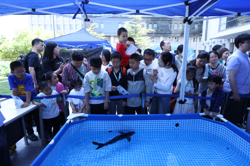 5月24日,觀眾正在觀察水下仿生機器魚。