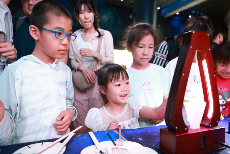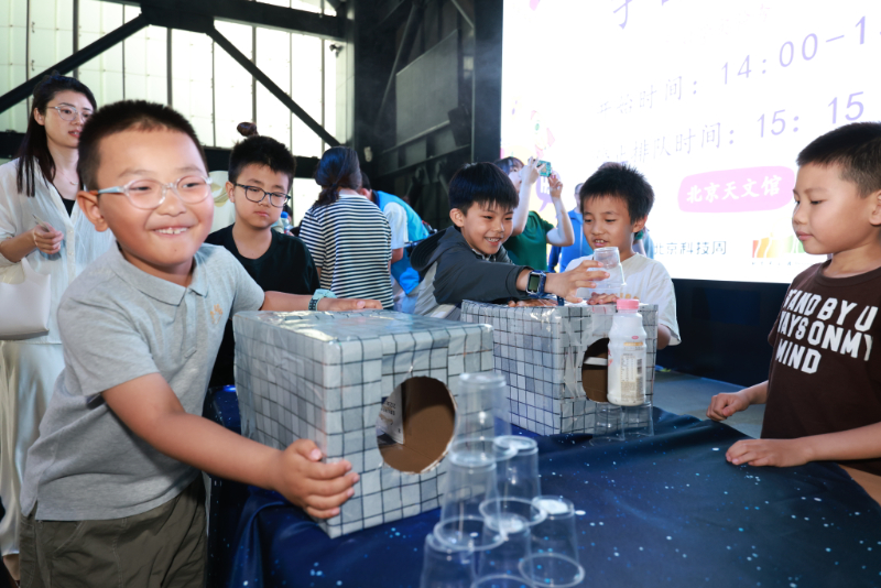 5月25日,小朋友們在北京市天文館體驗隔空打水杯。