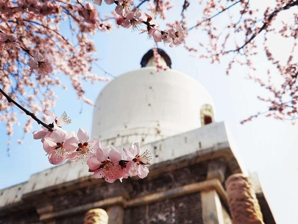 春半日暖,晝夜平開。一場春雪過後,天氣回暖。北京市市屬公園裏岸柳青青、鶯飛草長。春花爛漫,北海公園山桃花開映白塔,花簇與古建相映生輝。