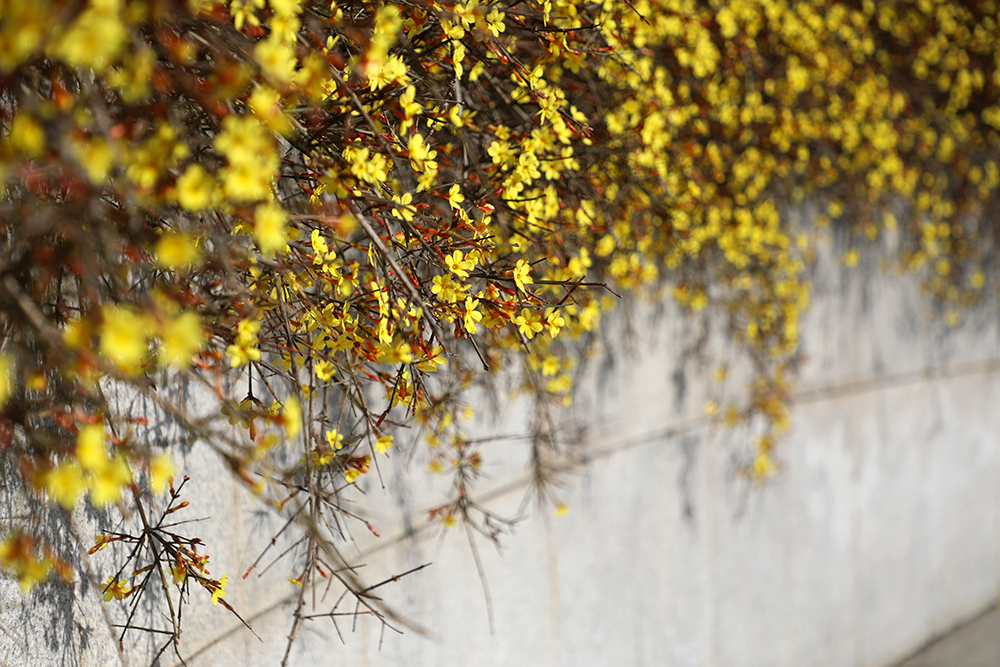 此時,迎春花開正盛,香山公園黃澄澄的花簇與園林建築相映成趣。