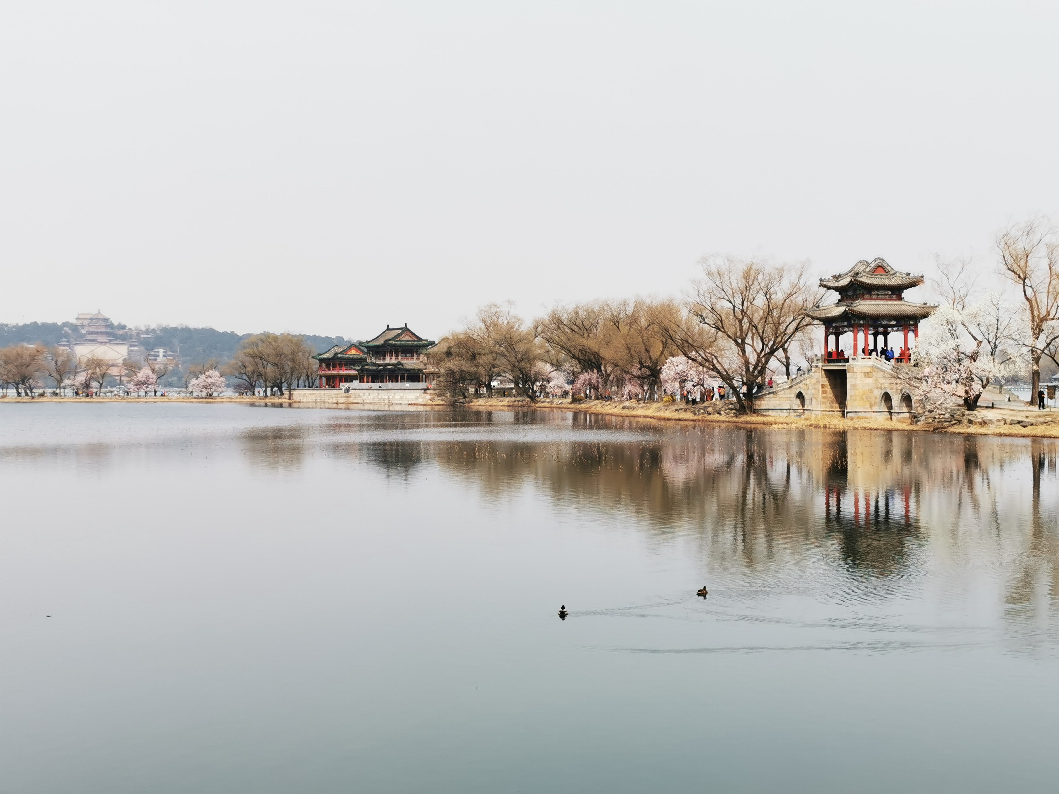 頤和園西堤柳枝發芽、山桃盛開,花中走如畫中遊。