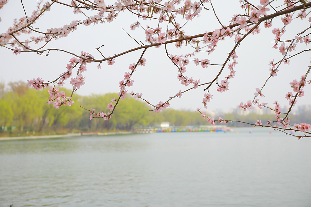 玉淵潭公園山桃花綻放枝頭,迎風搖曳。