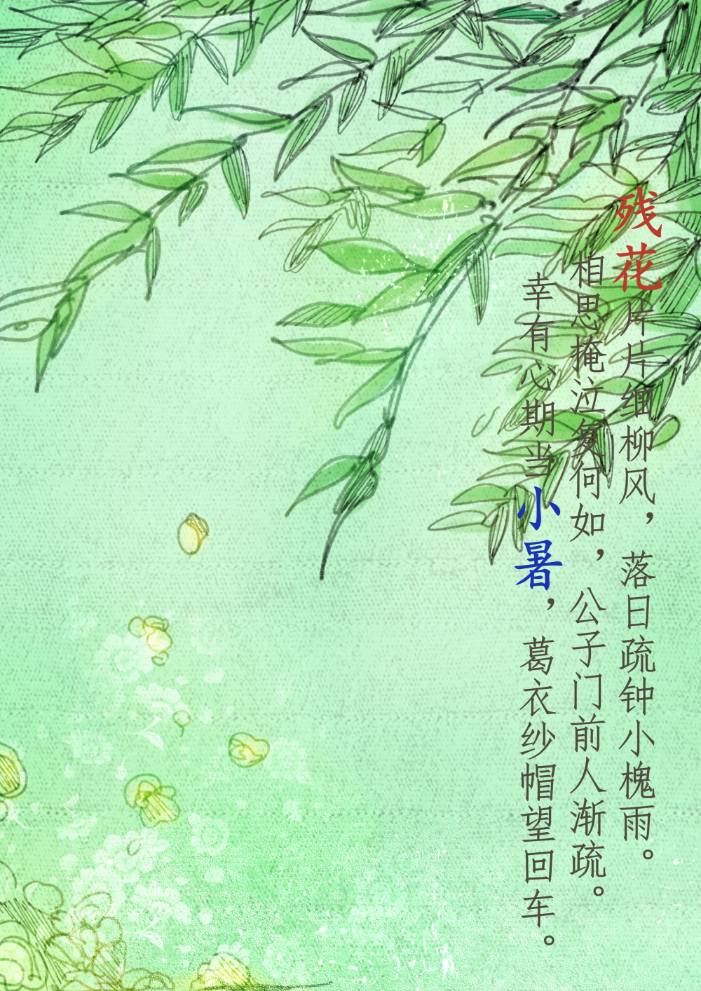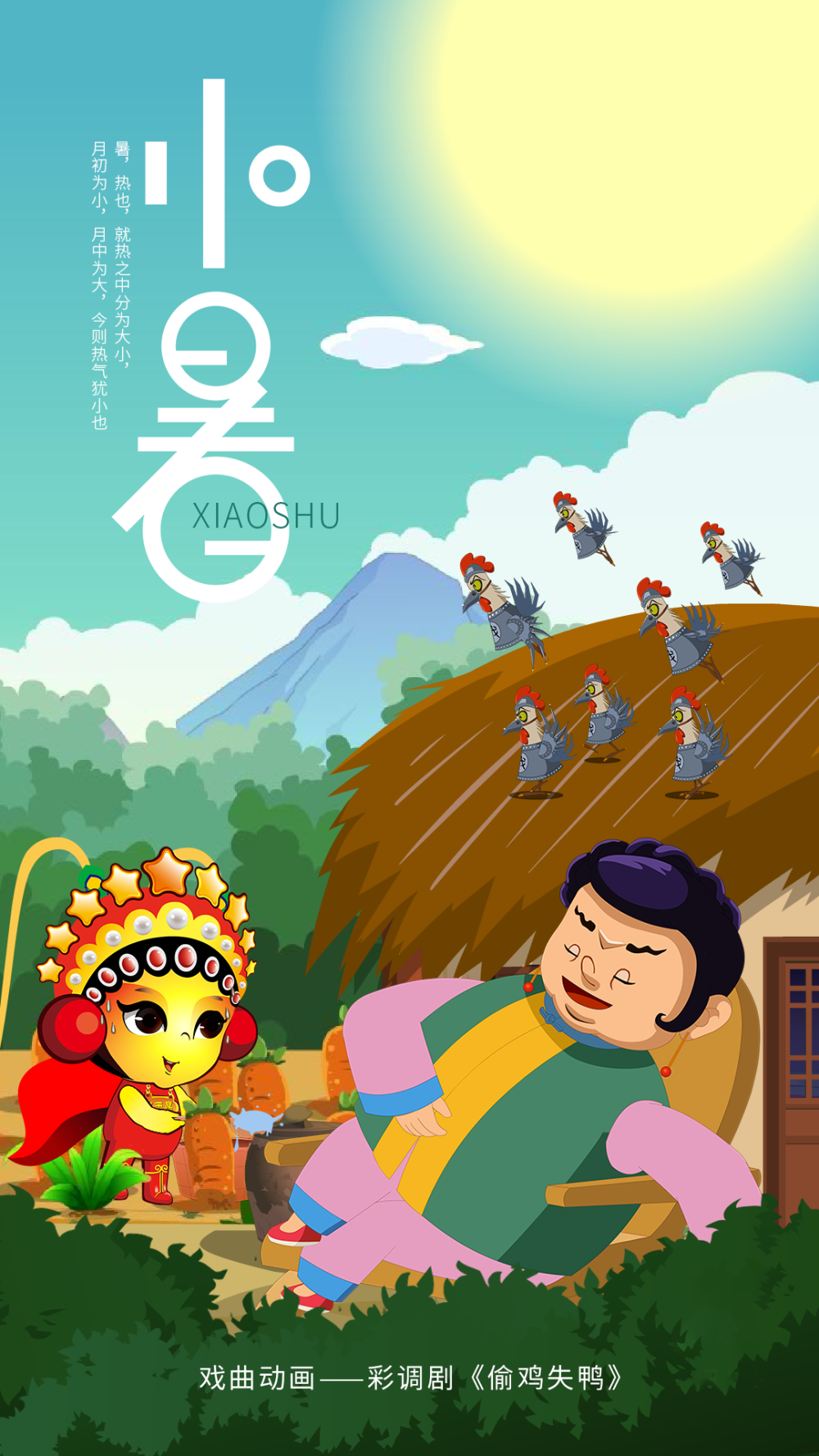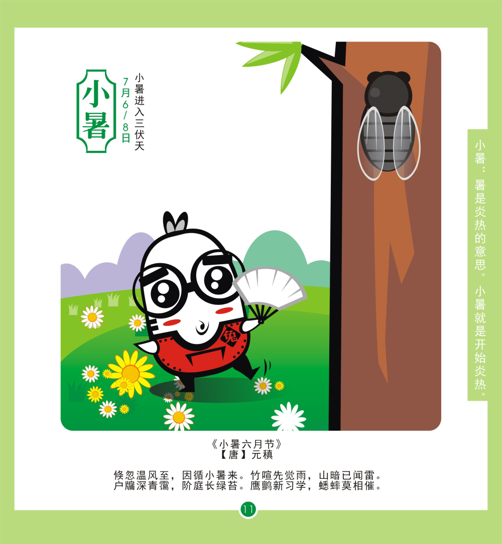 每年7月7日或8日視太陽到達黃經105°時為小暑。是夏天第五個節氣。民間有“食新”、“吃餃子”、“吃炒麵”等習俗。(作者:朱宇童)