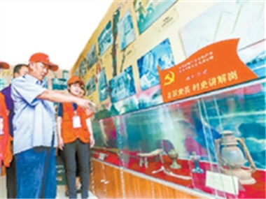 2018年,順義區焦莊戶村村史館內,黨員們為參觀者講述抗日戰爭時期開展地道戰的曆史。