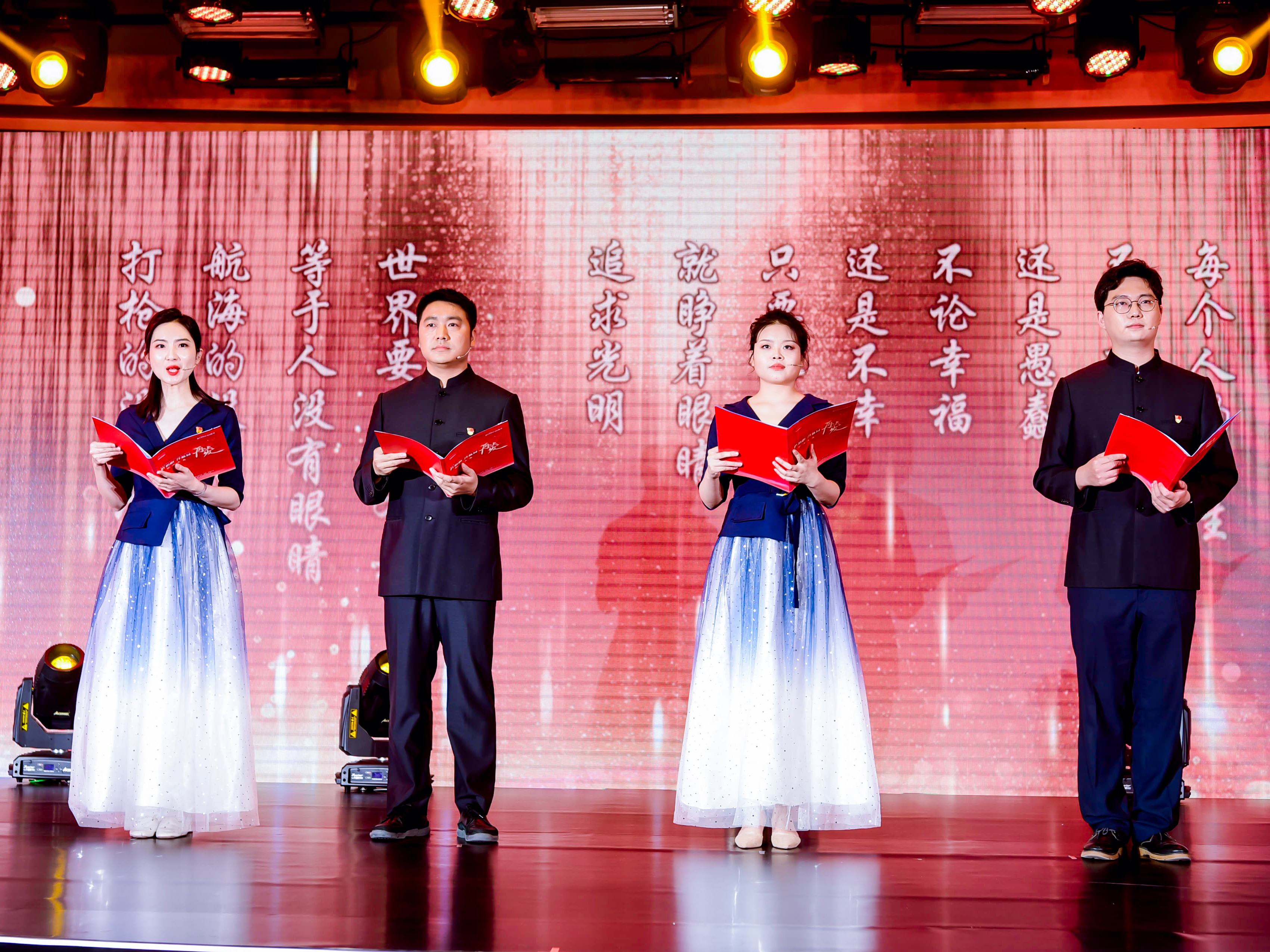 在第一篇章“銘記·苦難輝煌”中,著名演播藝術家梁言深情演繹現代名篇《紅船,從南湖起航》,首開集團員工代表和北京廣播電視台主持人劉佳、嘉佳激昂詮釋經典《長征組歌》,著名演播藝術家吳俊全、任亞明等攜手呈現有聲情景劇《中共中央在香山》。伴隨聲情並茂的朗讀,誦讀者們帶領大家踏進了浪濤洶湧的曆史長河,一起追憶黨從小小紅船到魏巍巨輪的壯闊發展曆程。