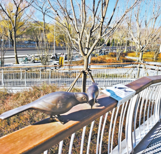 冬日午後,昆玉河水靜靜流淌,河東岸玲瓏路與藍靛廠南路交叉路口南側綠地中,休閑廊道蜿蜒向前。沿廊道漫步,不時就遇小“驚喜”:金鴴鳥、黑臉噪鶥、紅頸濱鷸……一組組“銅雀”立在扶手上,胖胖的,邊上還有銘牌介紹。來到懸空的“塔影台”遠眺,慈壽寺塔在望。近處,孩子們在遊樂設施的網繩區攀爬,老人在健身器材處鍛煉。