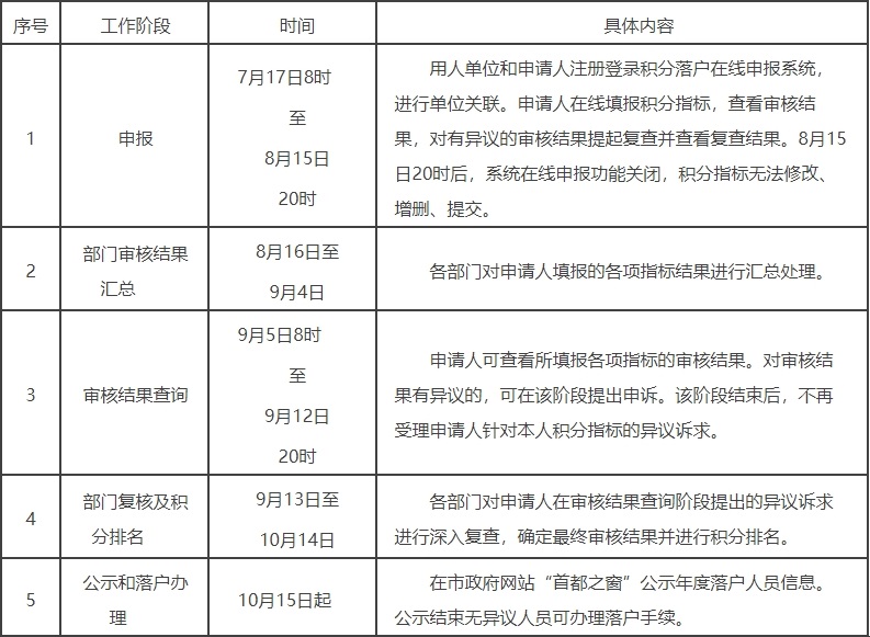 本市積分落戶工作為年度申報製。2020年申報工作分為申報、部門審核結果匯總、審核結果查詢、部門複核及積分排名、公示和落戶辦理5個階段。各階段安排如下: