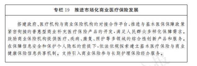 完善覆蓋全民、依法參加、職工和城鄉居民分類保障的基本醫療保險製度。優化基本醫保、大病保險與醫療救助保障製度。完善和規範職工大額醫療費用補助等補充醫療保險製度。積極調動慈善醫療救助力量,支持職工醫療互助有序發展。鼓勵引導發展商業健康保險。完善重大疫情醫療救治保障製度。促進各類醫保製度互補銜接,提高重特大疾病和多元醫療需求保障水平。